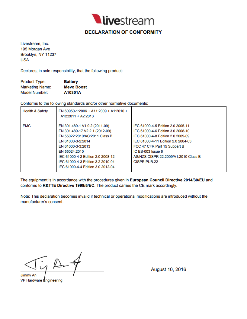 Declaration of Conformity - Mevo Boost January 30, 2025 21:55 The below PDF declares that Mevo Boost is in accordance with the procedures and conforms to the R&TTE Directive 1999/5/EC. BoostDeclarationofConformity_-_signed-0425.pdf